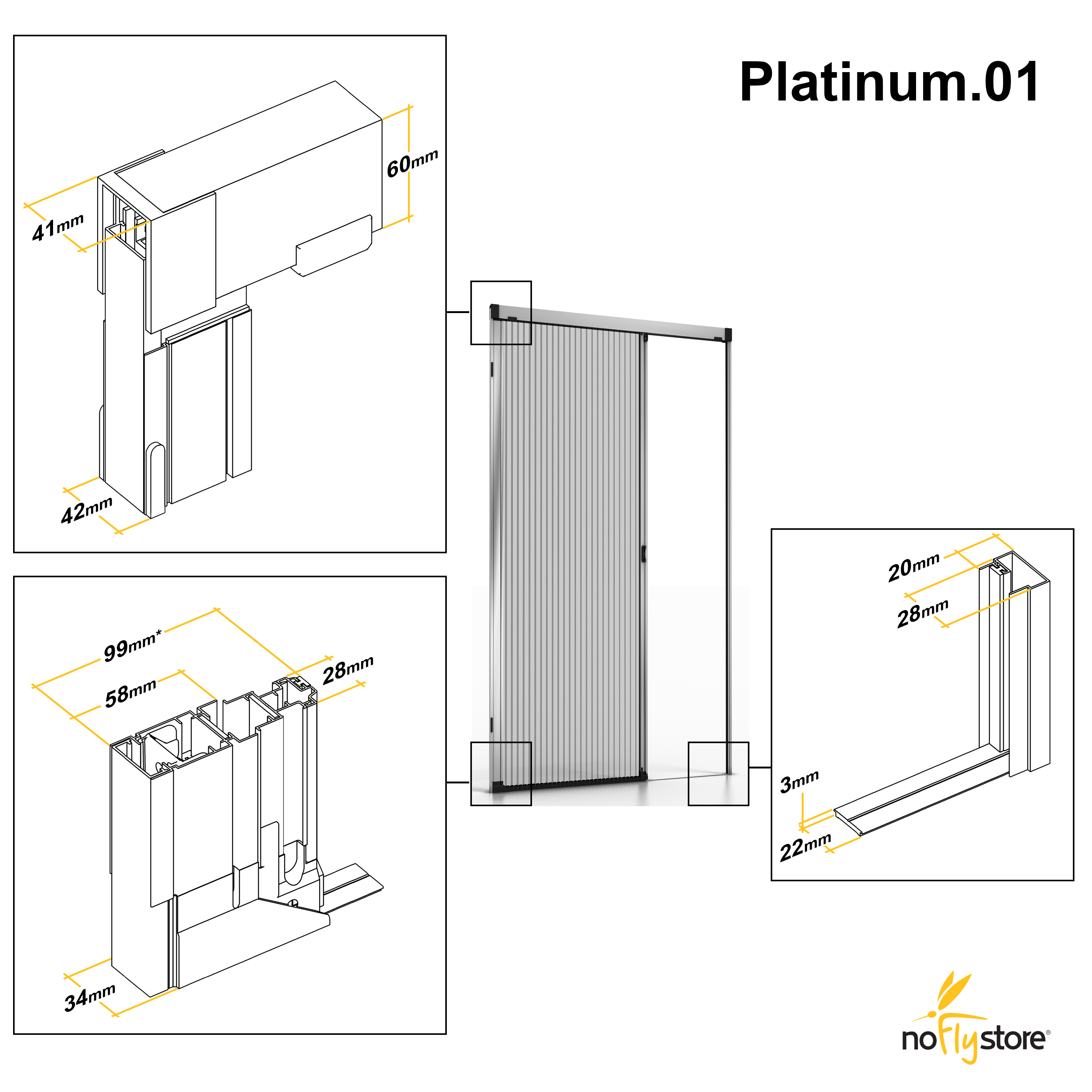 PLATINUM.01 ist ein NoFlyStore-Fliegengitter mit einem plissierten Netz mit seitlicher Gleitbewegung, die eigens zur Anwendung auf Türen und Fenstertüren entwickelt wurde und mit einer sehr schmalen, nur drei Millimeter hohen Führung im Fußboden versehen sind. Ein Rekordmaß, welches das Alltagsleben leichter gestaltet: für jene, die auf dem Balkon ein- und ausgehen, es jeden Tag reinigen, für Ihr Kind, das von der Küche in den Garten rennt. Eine große Bequemlichkeit auch für Behinderte und Betagte mit eingeschränkter Mobilität.